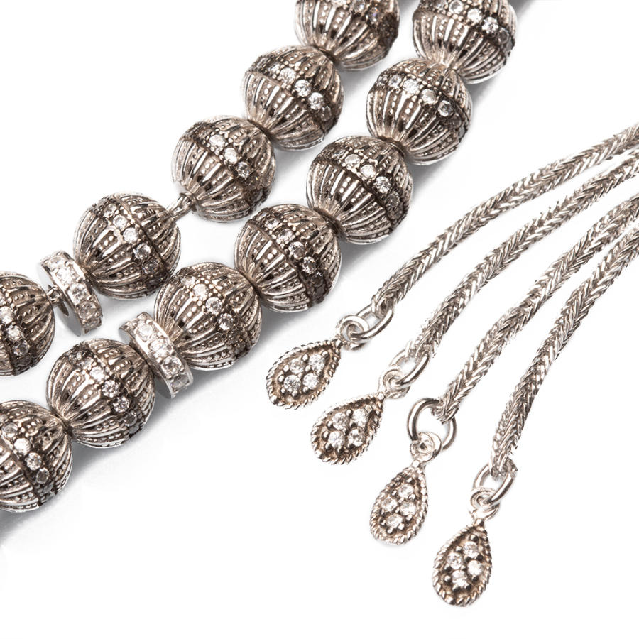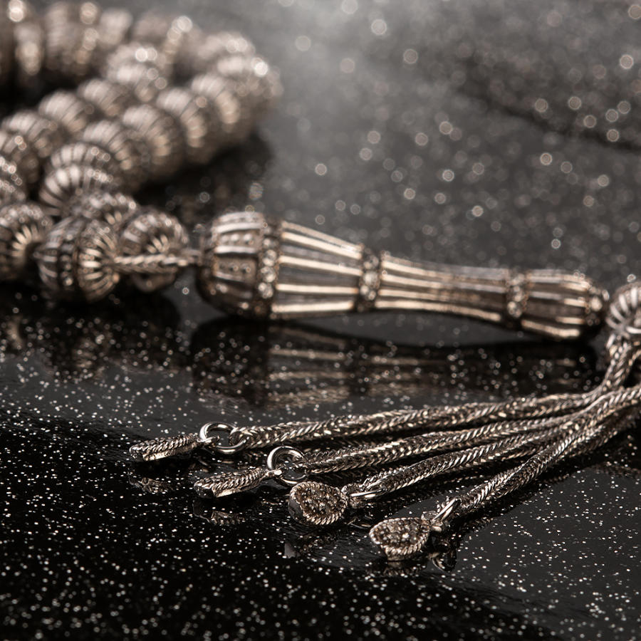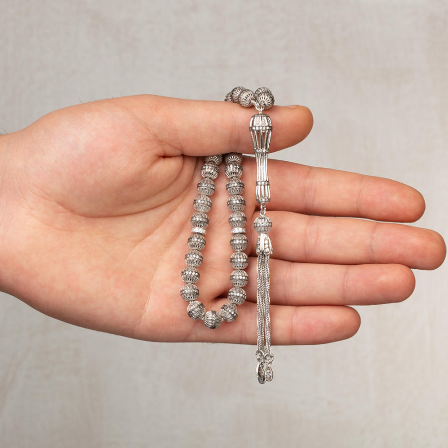 Weißer Zirkonstein, bestickt, silberfarben, silberfarbene Gebetsperlen, Produktmerkmale: Gesamtlänge: 24 cm, Gewicht: 51,6 g, Partikelgröße: 7 Wenn Sie auf der Suche nach einer besonderen Gebetskette sind, die Ihre Eleganz ergänzt, kann Ihnen dieses Modell weiterhelfen. Dieses aus 7 x 7 mm großen Körnern gefertigte Accessoire hat eine Gesamtlänge von 24 cm und ein Silbergewicht von 51,6 Gramm. Die Rosenkranzperlen, die Quaste und die Quastenspitzen sind mit weißen Zirkonsteinen verziert und die Länge der Quaste beträgt 7 cm. Bestellen Sie jetzt und erhalten Sie ein stilvolles Accessoire mit kostenlosem Versand. Was ist Filigran? Als Filigran werden allgemein alle künstlerischen Verfahren bezeichnet, die mit Draht hergestellt werden. Die Geschichte der Filigranarbeit, der Kunst der Silberverarbeitung aus der Region Mardin, reicht bis ins Jahr 3000 v. Chr. zurück. Man erhält sie, indem man Silberdrähte mit einem Spezialwerkzeug auf die gleiche Dicke schneidet und den Draht strickt. Filigranarbeit ist ein vollständig handgefertigter Prozess . Zu diesem Zweck werden die Drähte oval, rund usw. um sich selbst geformt. Sie werden umhüllt, indem sie Formen bilden. Vorteile von Silber Es ist die erste bekannte antibiotische Substanz. Es hat antimikrobielle Eigenschaften. Es schützt vor Strahlung. Es reduziert Elektrizität und beugt Stress vor. Es ist bekannt dafür, dass es bei Krankheiten wie Diabetes, Schuppenflechte und Juckreiz hilft. Klicken Sie hier, um zum Blogbeitrag mit dem Titel „5 unbekannte Vorteile des Silberelements“ zu gelangen