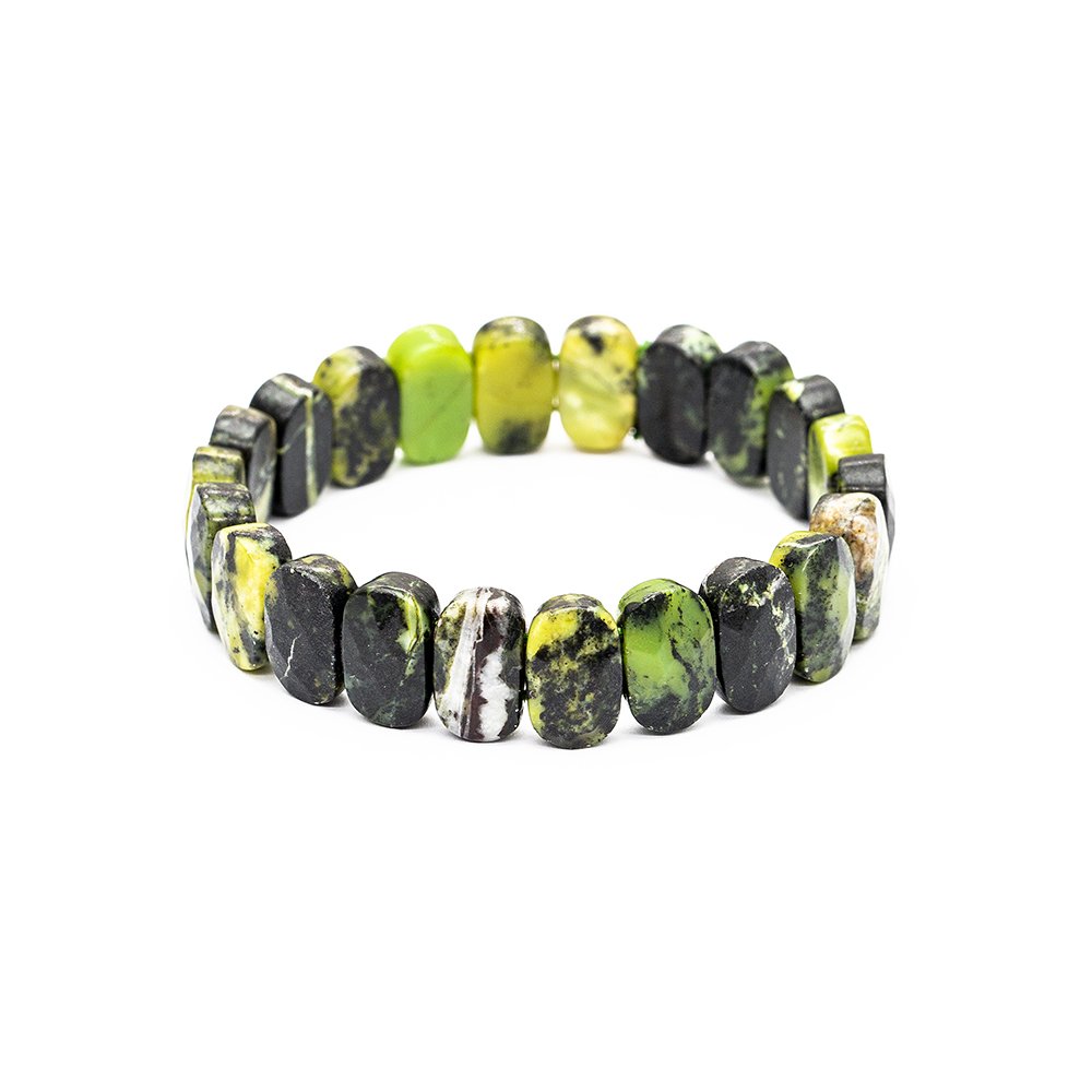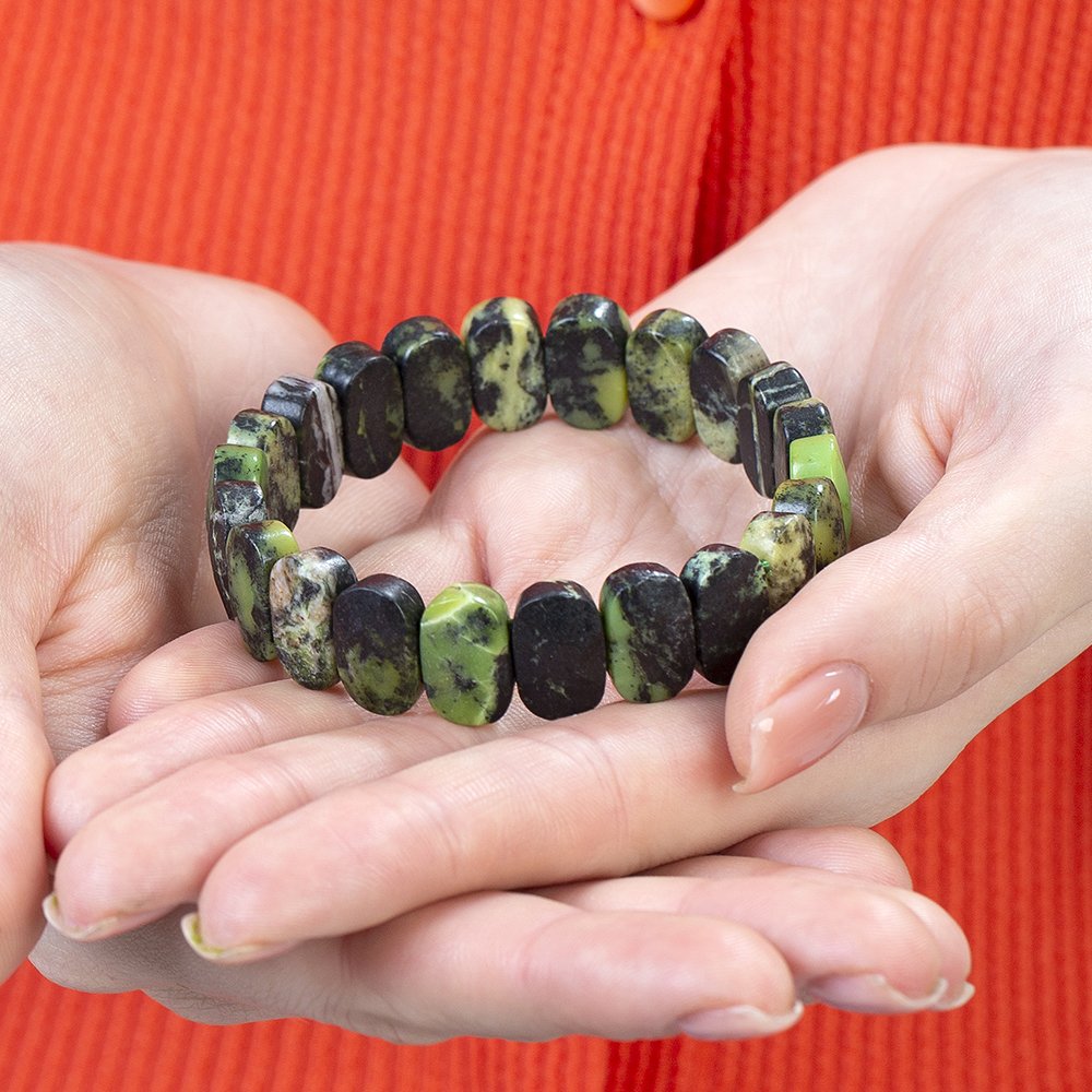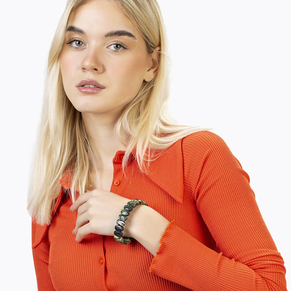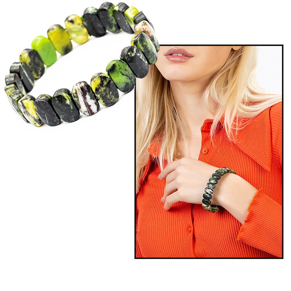 Hergestellt: Naturstein. Verwendeter Stein: Jade. Farbe: Grün-Schwarz. Gewicht: 34,15 g. Länge: Elastisch Vorbereitungszeit: 1 Werktag Produktverpackung Ihr Produkt wird mit einer Schutzverpackung mit Ihrem Logo versendet. Spezielle Optionen für Geschenkboxen finden Sie in der Kategorie „Geschenkbox“ im Menü. Beschreibung des Natursteins Jade: Jade ist ein harter, kostbarer Stein, der seit Jahrhunderten zur Herstellung von Schmuck und kleinen Skulpturen verwendet wird und meist in grüner Farbe vorkommt. Die wertvollsten sind Smaragdjade und burmesische Jade. Die Farben Schwarz, Grau, Rot und Blau sind nicht nur hauptsächlich Grün und seine Schattierungen, sondern geben der Jade auch bei der Verwendung als Schmuck besondere Namen. Die reichsten Jadevorkommen der Welt befinden sich in Burma, China, Neuseeland und Mexiko. Jade wird seit langem in der Nähe von Hotan, Yarkand, Turkestan und dem Baikalsee abgebaut. In Museen werden chinesische, Buddha- und aztekische Kleinskulpturen und Kunstwerke aus Jade ausgestellt. Die Verwendung von Jade als Kunstrohstoff ergibt sich aus seiner eng ineinandergreifenden Kristallstruktur. Mit dieser Funktion können sehr feine Schnitzarbeiten auf Jade ausgeführt werden. Da es viel härter als Marmor ist, ist es klimabeständig.