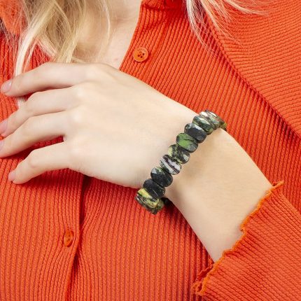 Hergestellt: Naturstein. Verwendeter Stein: Jade. Farbe: Grün-Schwarz. Gewicht: 34,15 g. Länge: Elastisch. Vorbereitungszeit: 1 Werktag. Produktverpackung. Ihr Produkt wird mit einer Schutzverpackung mit Ihrem Logo versendet. Für spezielle Geschenkbox-Optionen können Sie sich unsere Kategorie „Geschenkbox“ im Menü ansehen. NatursteinbeschreibungJade: Jade ist ein harter, kostbarer Stein, der seit Jahrhunderten für Schmuck und kleine Skulpturen verwendet wird und meist in grüner Farbe vorkommt. Die wertvollsten sind Smaragdjade und burmesische Jade. Die Farben Schwarz, Grau, Rot und Blau sind nicht nur hauptsächlich Grün und seine Schattierungen, sondern geben der Jade auch bei der Verwendung als Schmuck besondere Namen. Die reichsten Jadevorkommen der Welt befinden sich in Burma, China, Neuseeland und Mexiko. Jade wird seit langem in der Nähe von Hotan, Yarkand, Turkestan und dem Baikalsee abgebaut. In Museen werden chinesische, Buddha- und aztekische Kleinskulpturen und Kunstwerke aus Jade ausgestellt. Die Verwendung von Jade als Kunstrohstoff ergibt sich aus seiner eng ineinandergreifenden Kristallstruktur. Mit dieser Funktion können sehr feine Schnitzarbeiten auf Jade ausgeführt werden. Da es viel härter als Marmor ist, ist es klimabeständig.