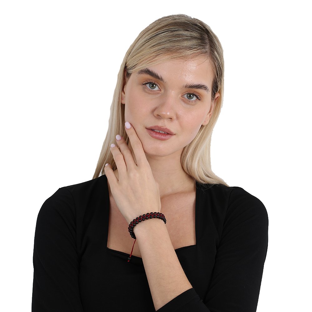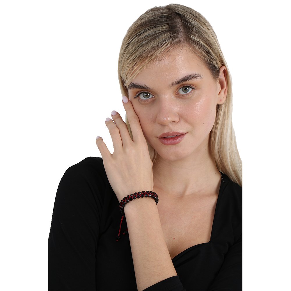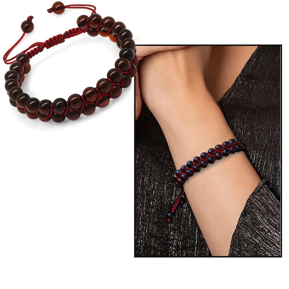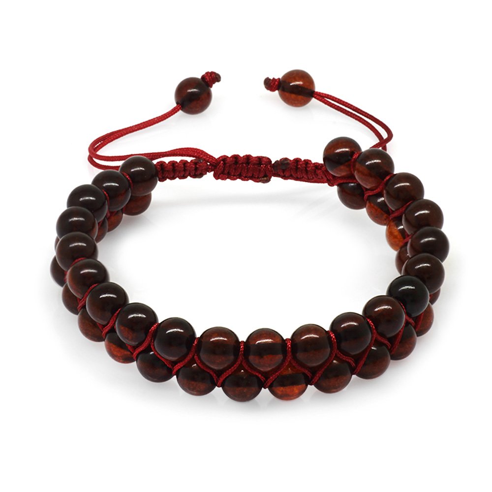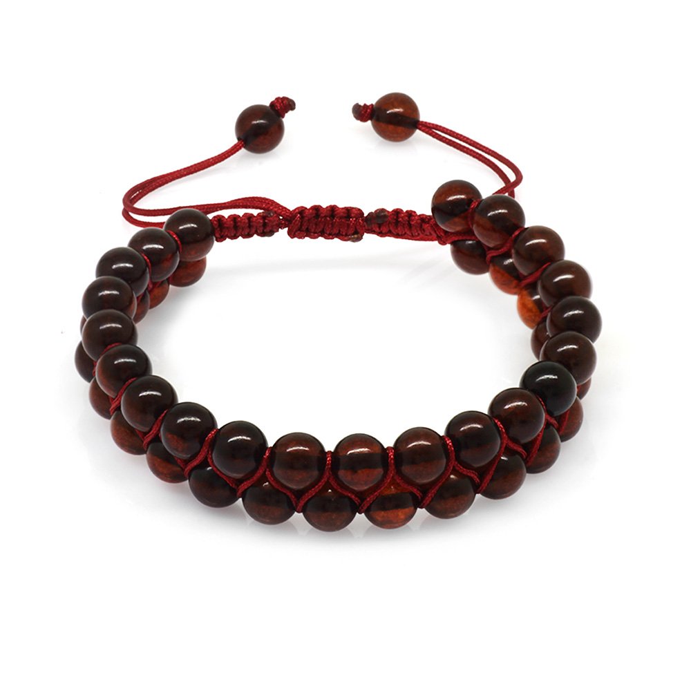 Zweireihiges Makramee-Armband mit geflochtenem Kugelschliff, rotem Naturtropfen-Bernstein für Damen