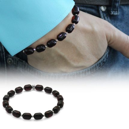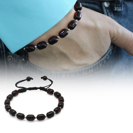 Dunkelrotes, tropfenförmiges Bernstein-Herrenarmband im Kapselschliff